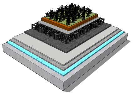 The Fatra Armour protection mat is installed directly over the PVC membrane to provide protection to the waterproofing system from any sharp edges and pertruding items which might be present in the green roof overlaying finishes