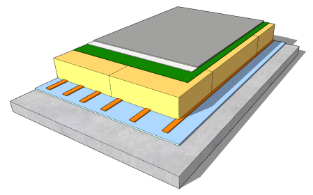 The Fatrafol 807v has a fleece backing which enables the PVC membrane to be fully adhered directly to the PIR tissue faced insulation board using the Fatrabond 1215 moisture curing polyurethane adhesive.