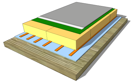 The Fatrafol 807v has a fleece backing which enables the PVC membrane to be fully adhered directly to the PIR tissue faced insulation board using the Fatrabond 1215 moisture curing polyurethane adhesive.