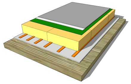 The Fatrafol 807v has a fleece backing which enables the PVC membrane to be fully adhered directly to the PIR tissue faced insulation board using the Fatrabond 1215 moisture curing polyurethane adhesive.